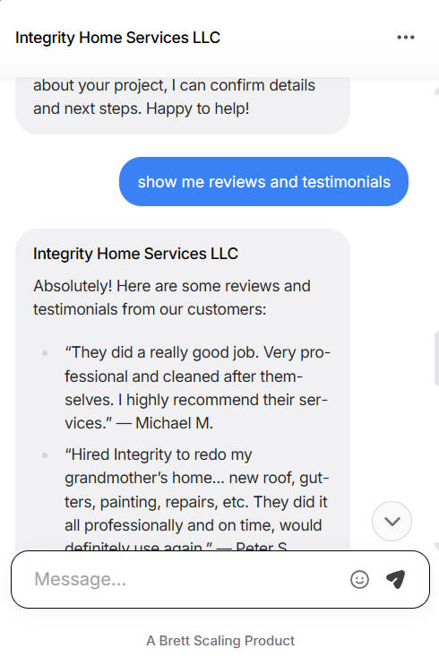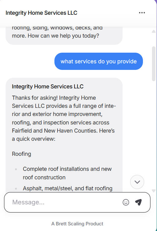 © Untitled. All rights reserved. BrettScaling provides chatbot installation and support services. BrettScaling is not responsible for any downtime, outages, or errors related to the client’s website hosting, domain configuration, third-party platforms, or external services beyond our control